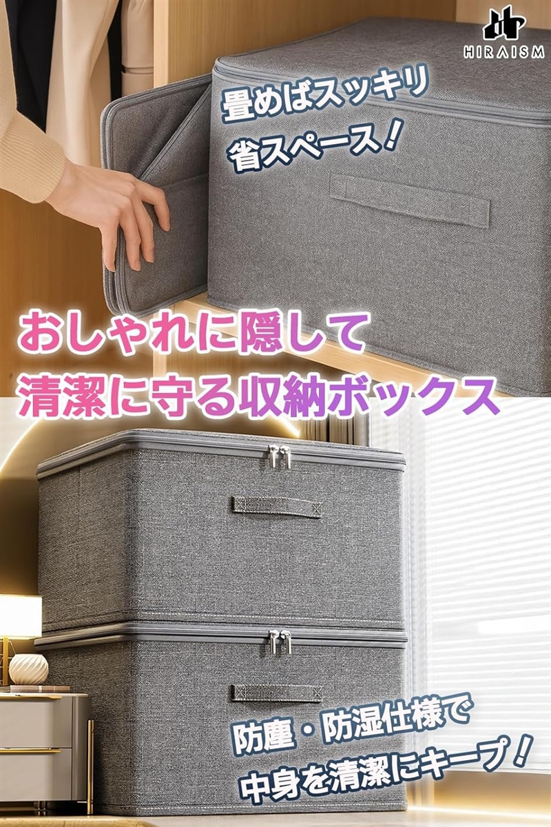 「おしゃれに隠して、清潔に守る収納ボックス」淡いグレーの上品なデザインが、どんなインテリアにも自然に馴染みます。