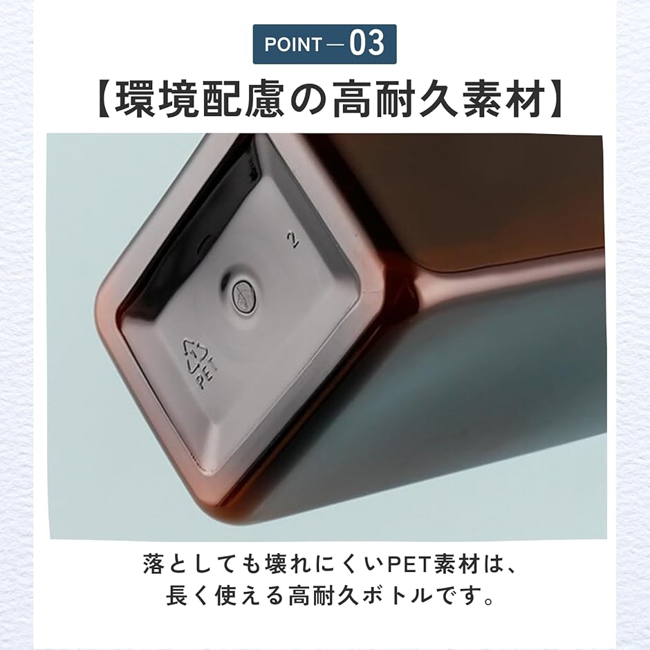 「環境配慮の高耐久素材」落としても壊れにくいPET素材は、長く使える高耐久ボトルです。
