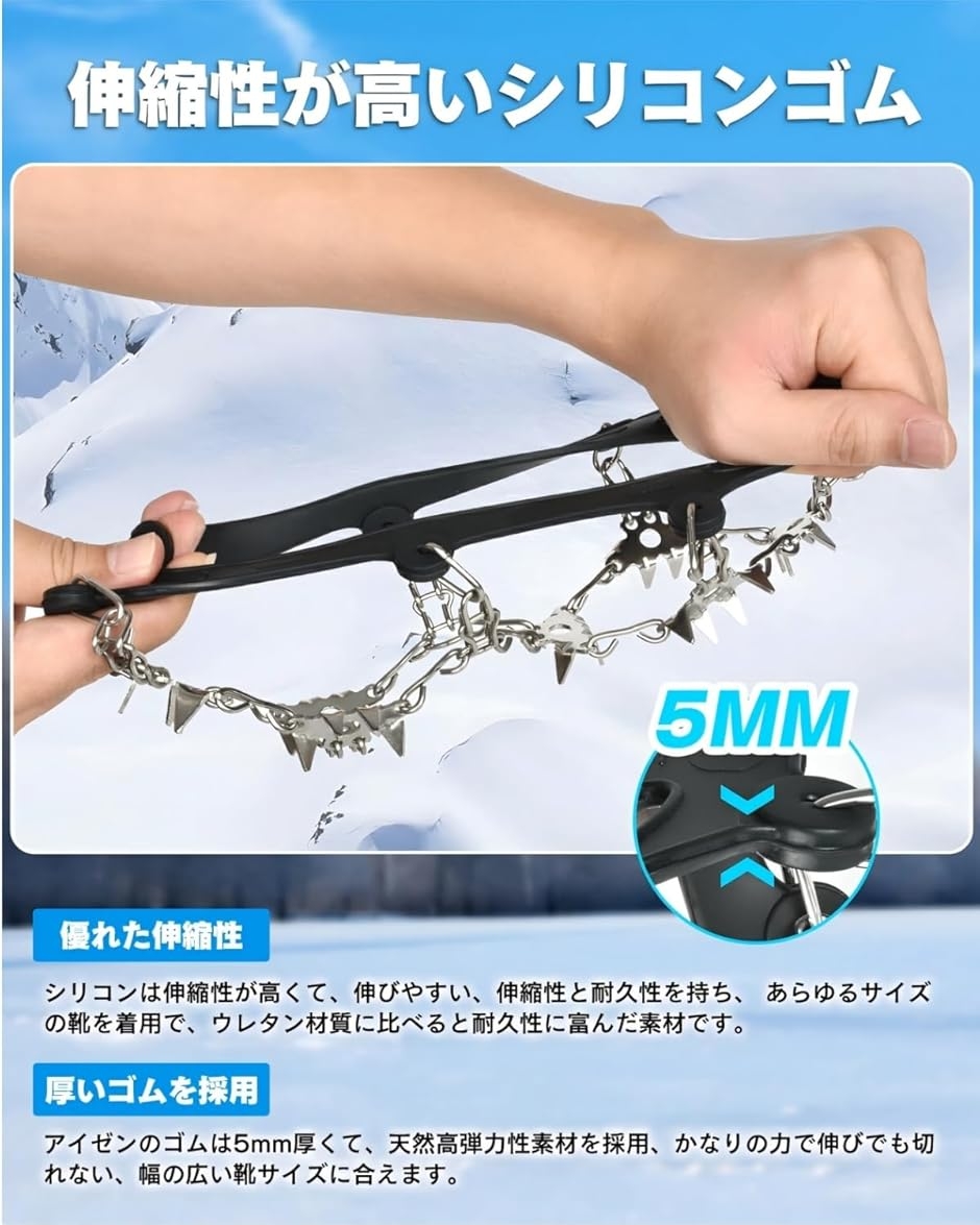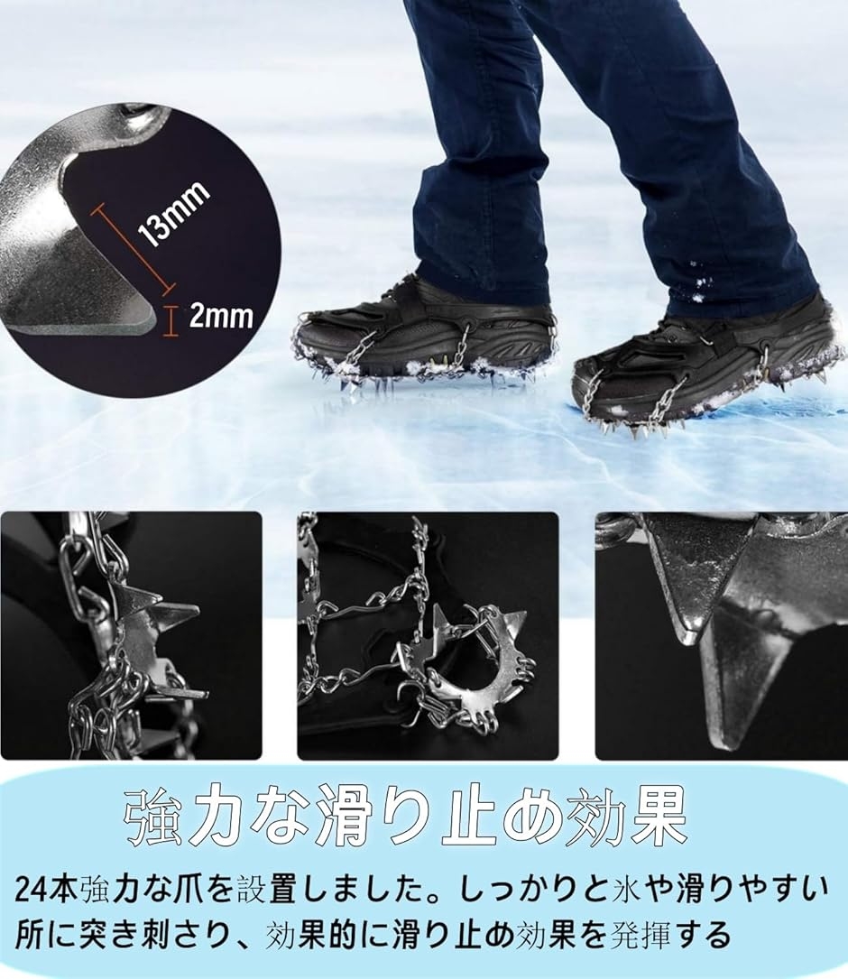 Point 3 「滑り止め性抜群」 本アイゼンの構造は全部で高強度マンガン鋼の24本爪が付いて、氷のような様々な表面上で優れたトラクションを提供します。