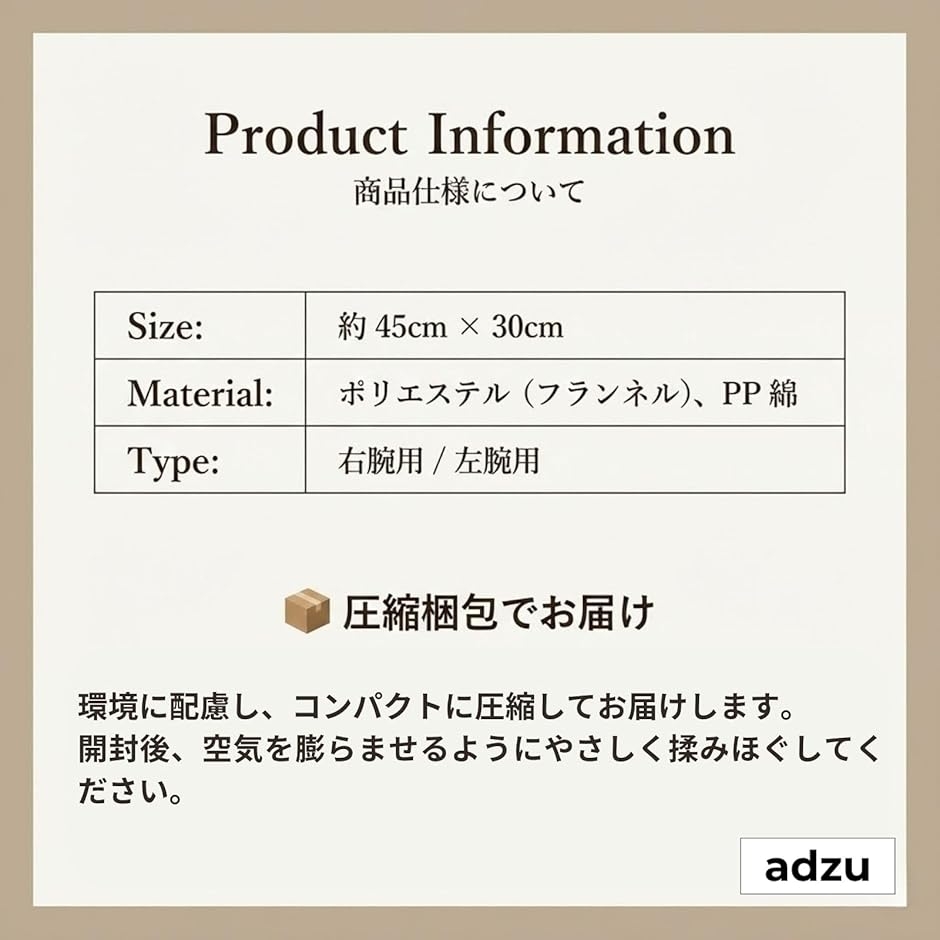「商品詳細」 サイズ:約45x30cm/素材:フランネル+PP綿/タイプ:右腕・左腕(カラー2種)/圧縮梱包でお届けします。