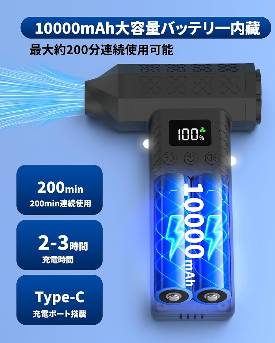「10000mAh大容量バッテリー&急速充電可能」10000mAhの大容量リチウムバッテリーを内蔵しており、約2-3時間フル充電で最大200分使用可能で、最高回転速度では約10分の強力な暴風を持続し、各種作業の円滑な完了を支えることができます。