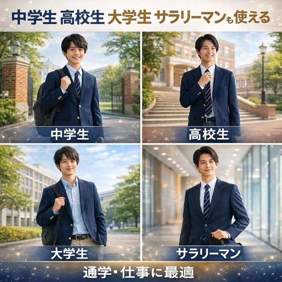 「学生から社会人まで幅広く活躍」 学生服、スーツ、作業着、カジュアルウェアなど、どんなスタイルにも自然にフィット。