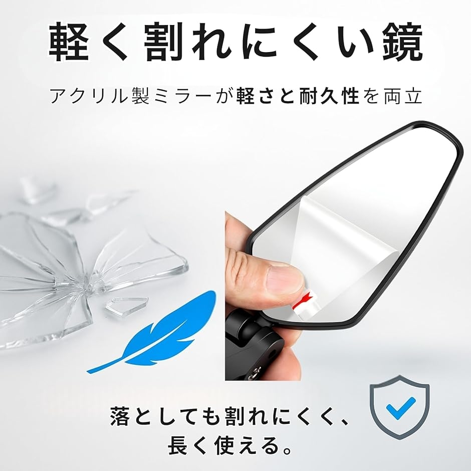 「割れにくく、軽く、美しく」 ミラー部分には軽量なアクリル素材を採用し、強化プラスチックのミラーフレームで耐久性を高めました。