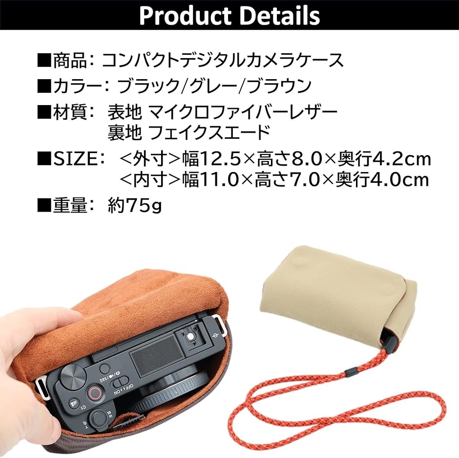 商品詳細:コンパクトデジタルカメラケース 「カラー」 3種 ブラック/コーヒー/グレー 「材質」 マイクロファイバーレザー・フェイクスエード 「SIZE」 外寸:幅12.5cmx高さ8.0cmx奥行4.2cm/内寸:幅11.0cmx高さ7.0cmx奥行4.0cm「重量」約75g *モニターの環境等により、色の見え方に若干差が生じる場合がございます。