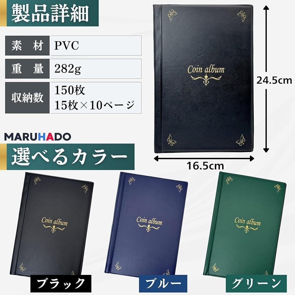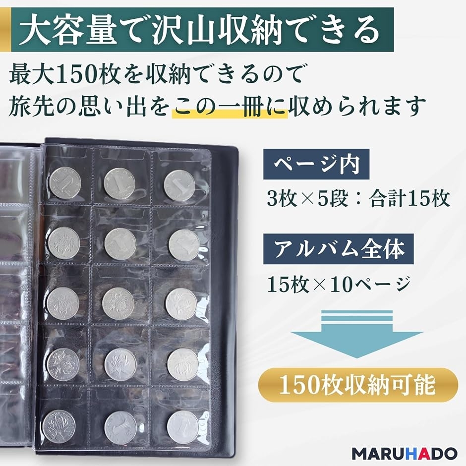 「大容量で整理しやすい」スーベニアメダルや記念硬貨、金貨、貨幣など、最大150枚をまとめて整理できるコインアルバムです。