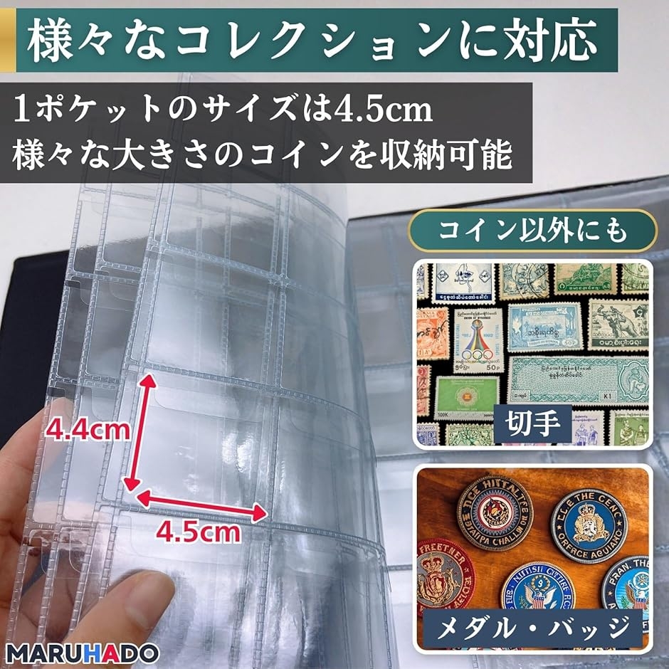 「幅広いコインに対応」1ポケットあたり内寸4.4x4.5cmで、スーベニアメダルや記念硬貨、金貨、古銭まで幅広く収納できます。
