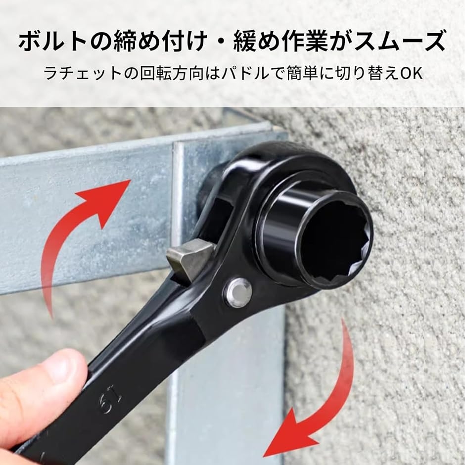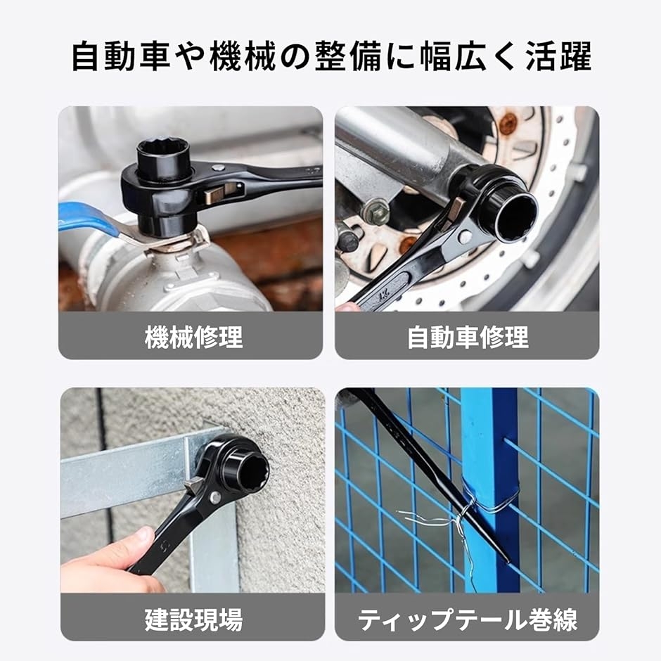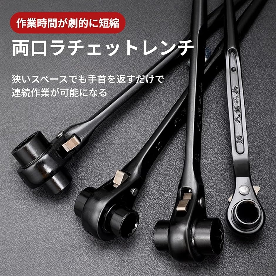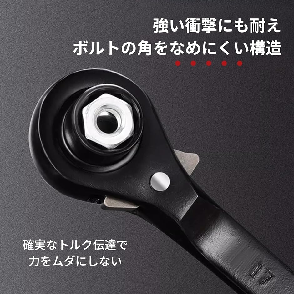 各種サイズの両口ラチェット機構を搭載し、ボルトの締め付け・緩め作業がスムーズ。