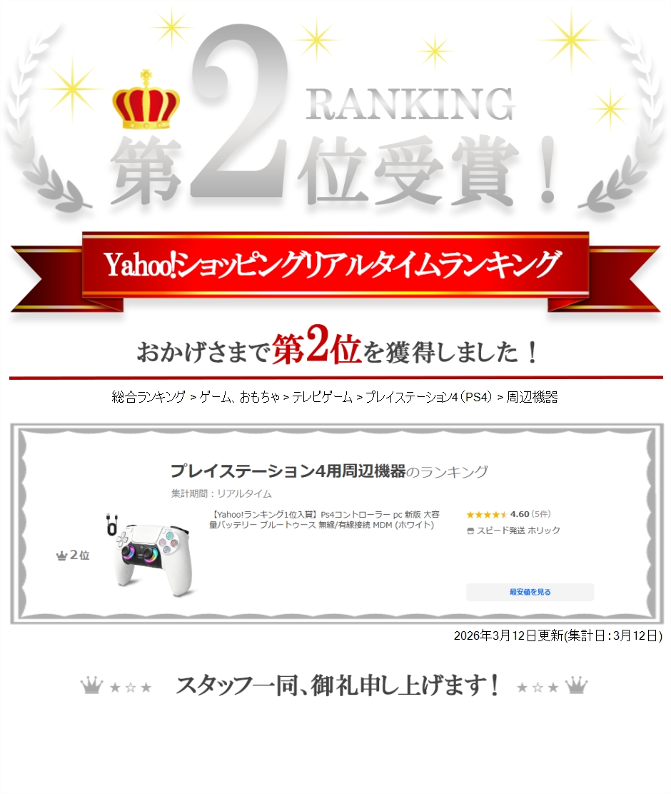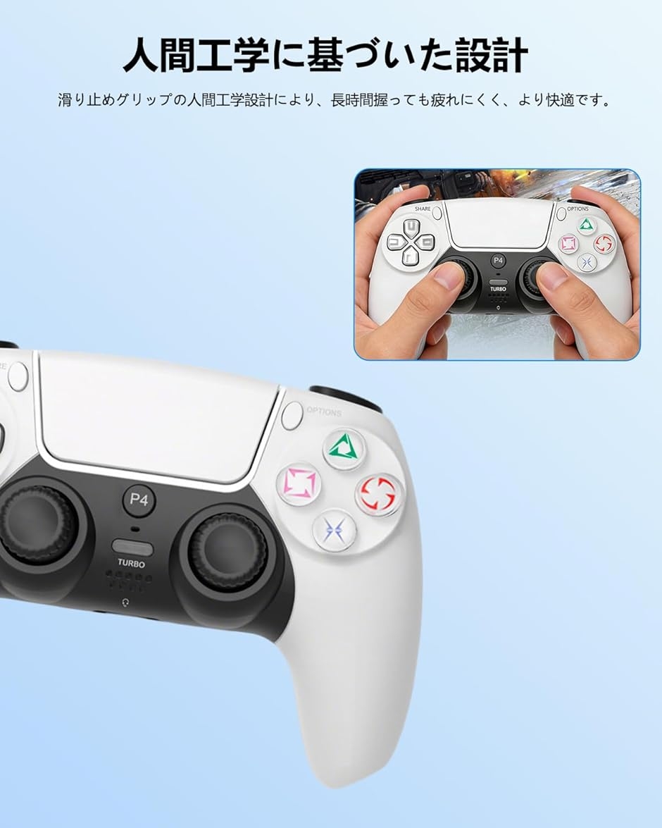 | 商品名 | Ps4コントローラー pc コントローラー pc 新版 大容量バッテリー ブルートゥース 無線/有線接続 6軸ジャイロセンサー機能 連射Turbo機能 人体工学 二重振動 |