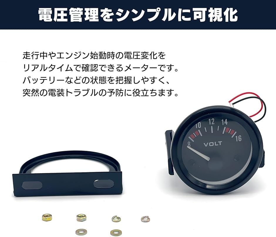 汎用品のため多くの車種に対応し、電圧8〜16V表示で安心して電装状態を確認できます。