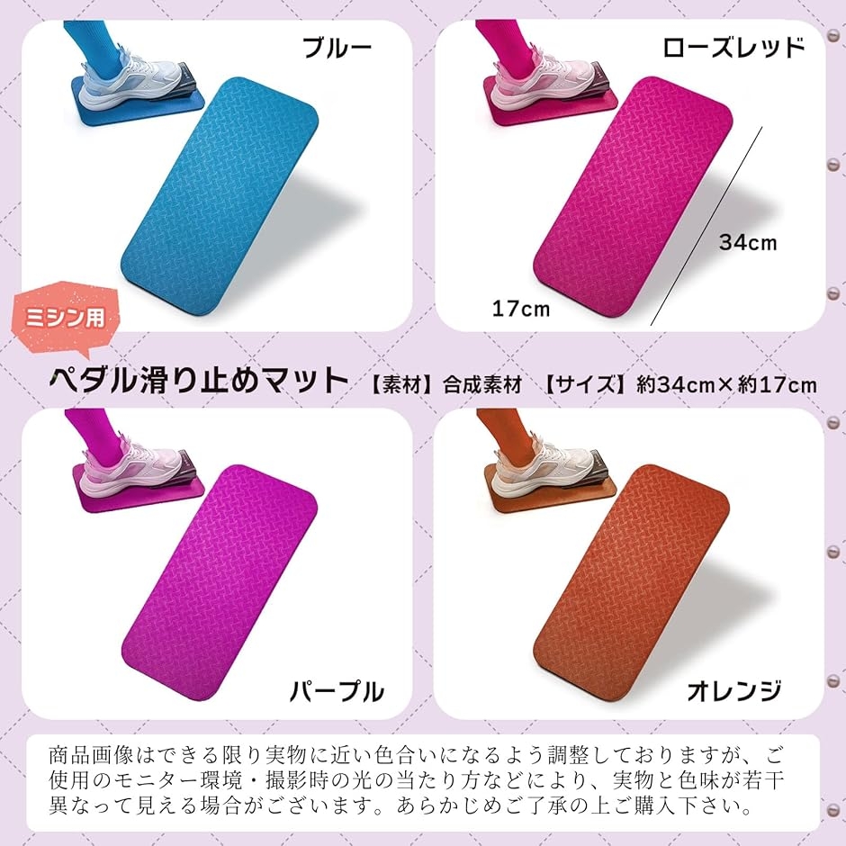 「商品内容」ミシン用 ペダル滑り止めマット「カラー」ブルー/パープル/ローズレッド/オレンジ「サイズ」約34cm x 約17cm「素材」合成素材