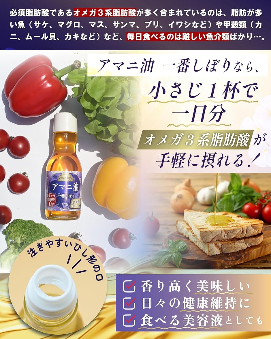 | 商品名 | 小さじ一杯で1日分のオメガ3 アマニ油 亜麻仁油 オメガ3 トランス脂肪酸ゼロx未精製x低温圧搾法xαリノレン酸x非遺伝子組み換え |