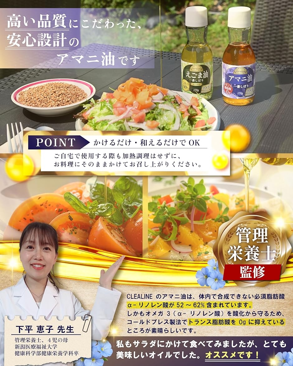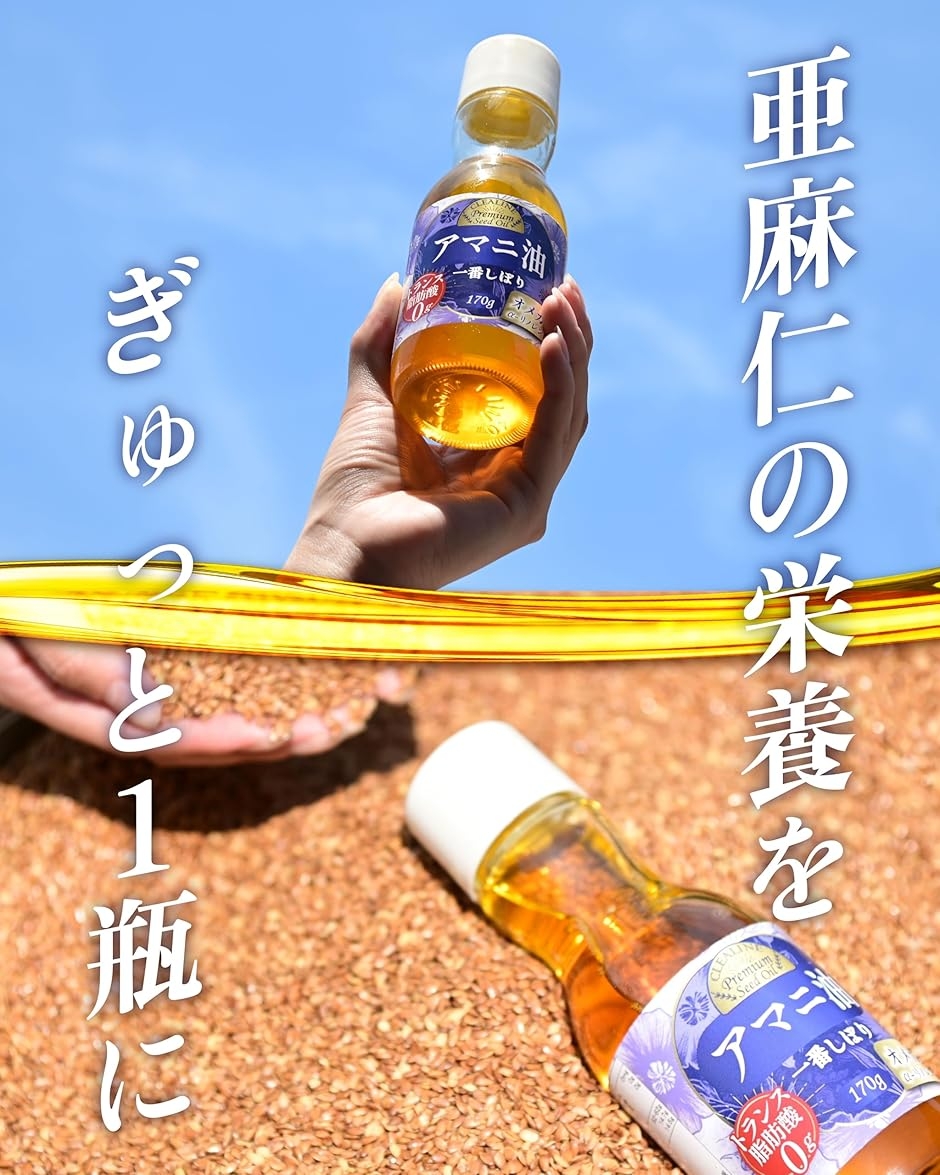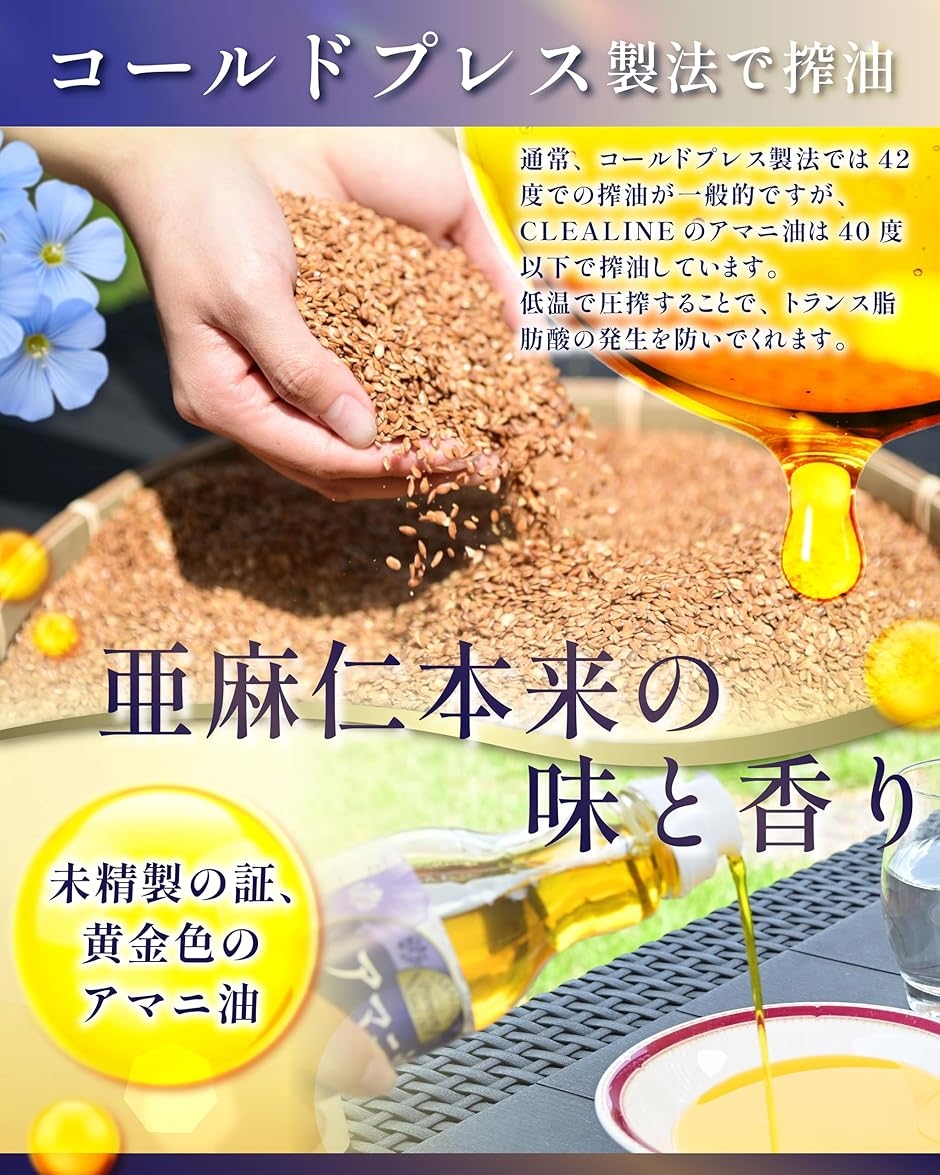 亜麻仁油の圧搾は通常42度で行われるところ、CLEALINEのアマニ油は40度以下の低温圧搾(コールドプレス製法)で製造されているため、トランス脂肪酸が0gです。