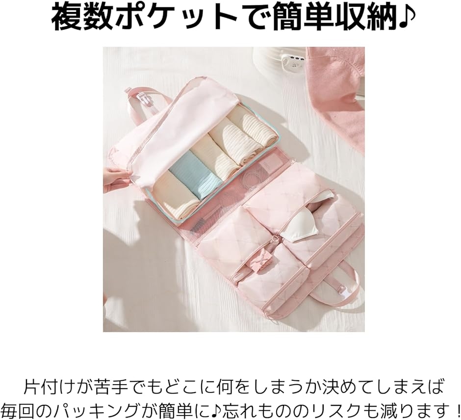 「多層構造・独立ポケット設計」 複数の内ポケットとゾーン設計で、下着・靴下・衣類を分けて収納可能。