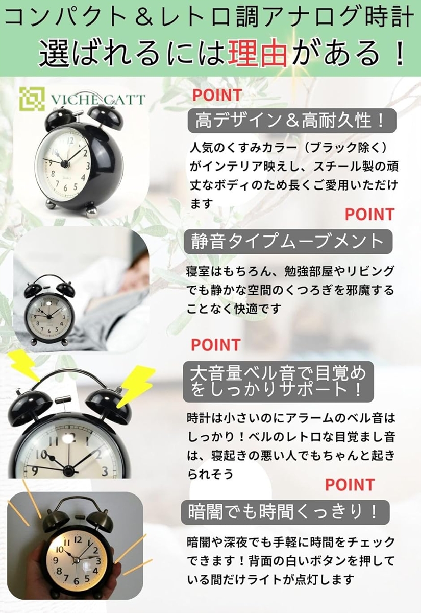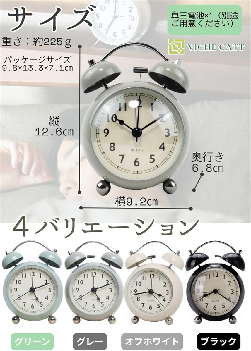 また、時計は小さくてもアラームのベル音はしっかり。ベルのレトロな目覚まし音は寝坊しがちな朝をサポート。 カラーはナチュラルインテリアに。