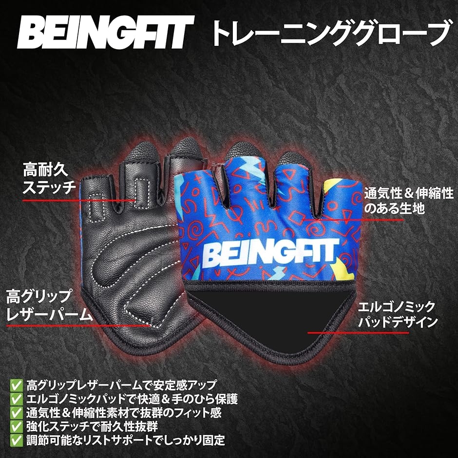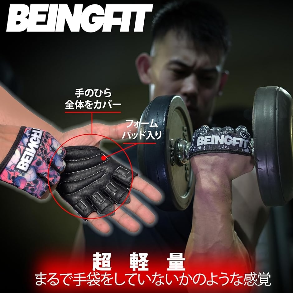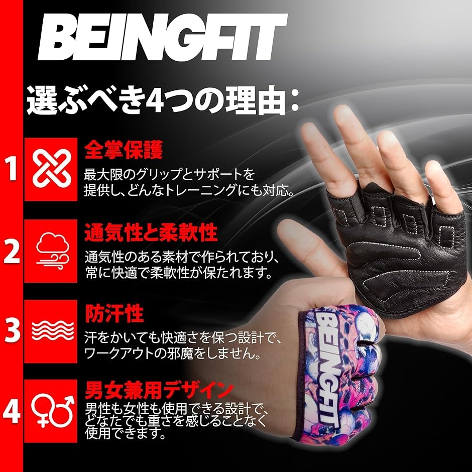 | 商品名 | Beingfit トレーニンググローブ 筋トレ メンズ レディース 指から手のひらまで 半指デザイン 着脱簡単 革製 手のひらで高グリップ&強度サポートのトレーニング手袋 ジム・フィットネス・懸垂に最適 3つのユニークデザイン |