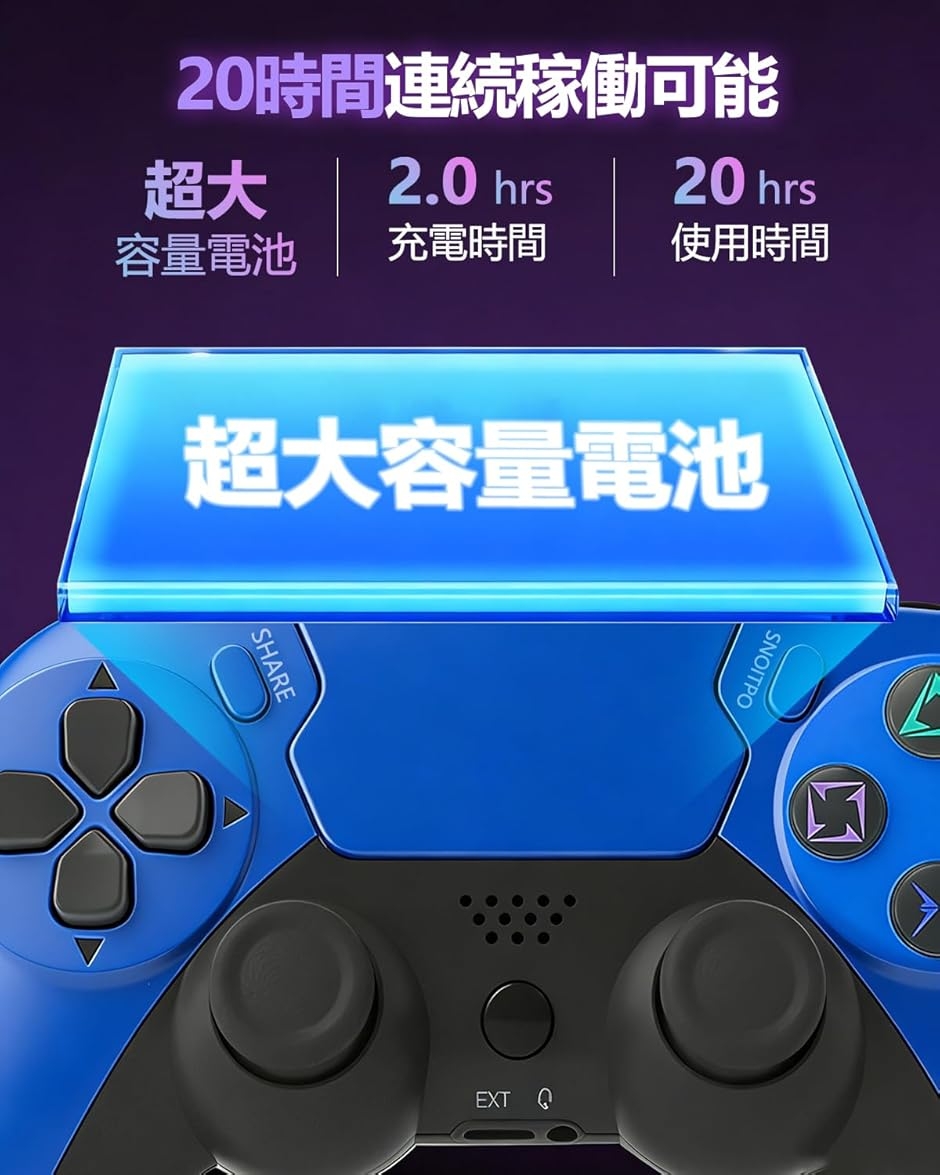 大容量バッテリーと急速充電(2 時間フル充電 / 最大 20 時間連続使用)、低電圧警報機能も搭載。ps4 コントローラーやワイヤレスコントローラーとして使用しても、機能性と握持感を両立した理想的なデザインです。