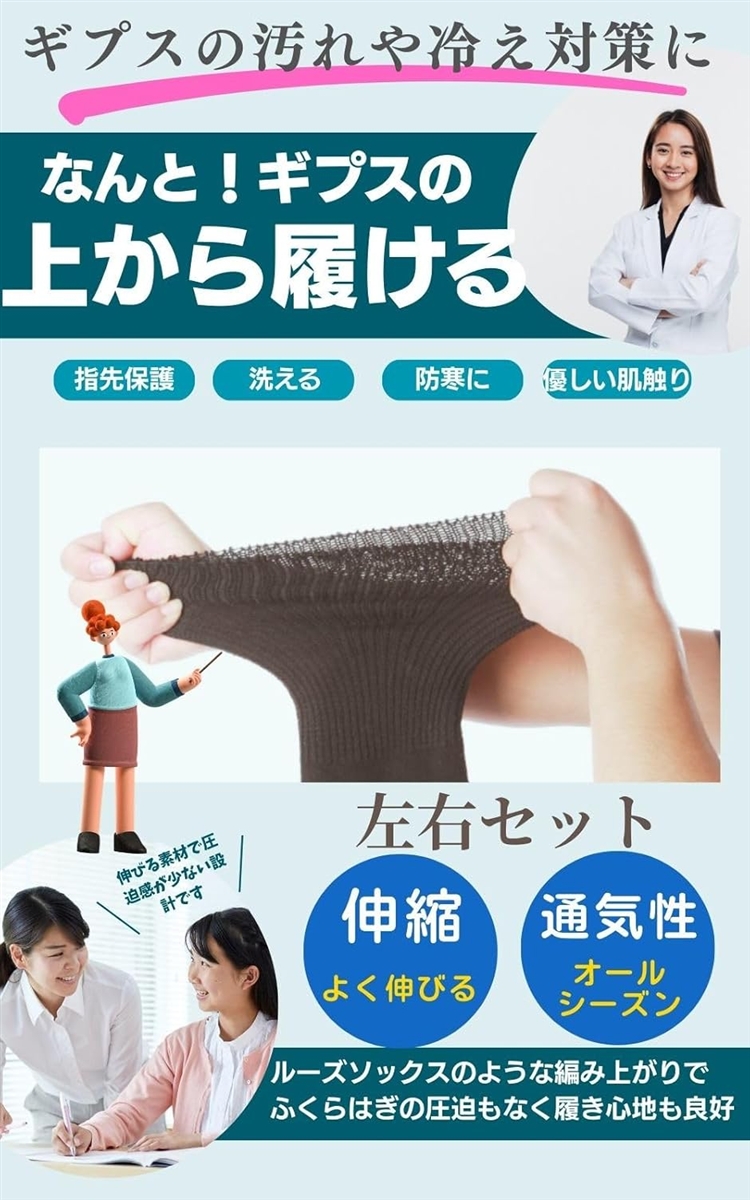 また、履き口が伸びているため、ギプスを装着しても楽に履け伸縮性もあるため、厚手でも伸ばしやすく長さもあるため冷えや外出の際の外風に当たることも軽減できます。