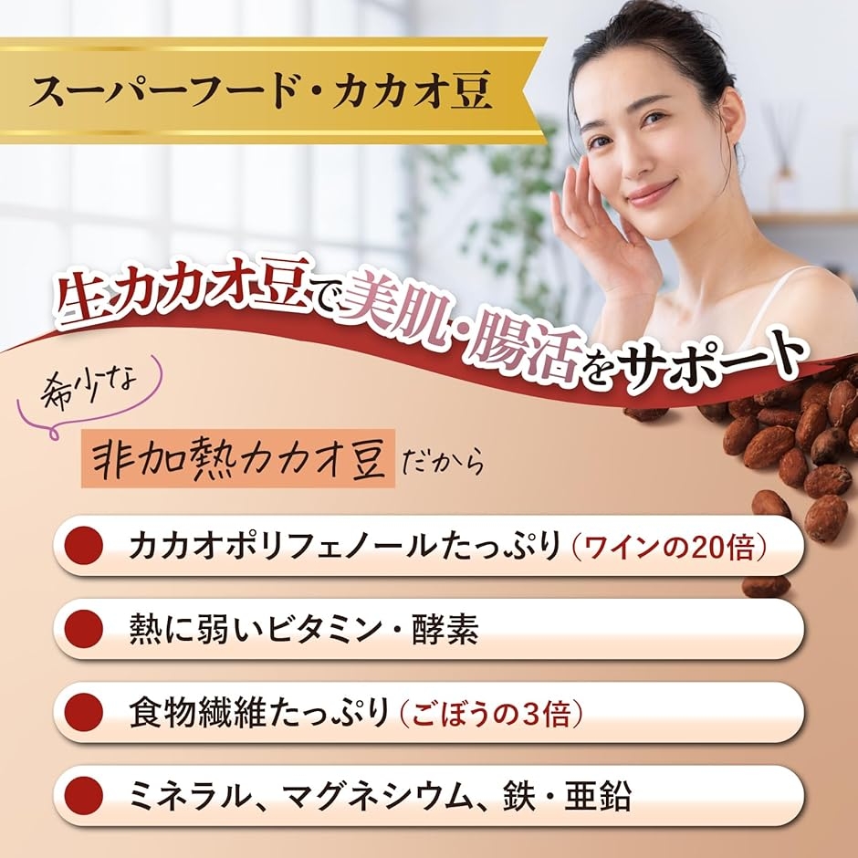 「生だから。美肌をサポート」生タイプのカカオ豆。
