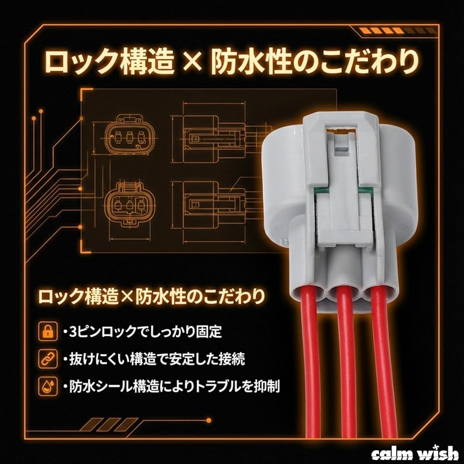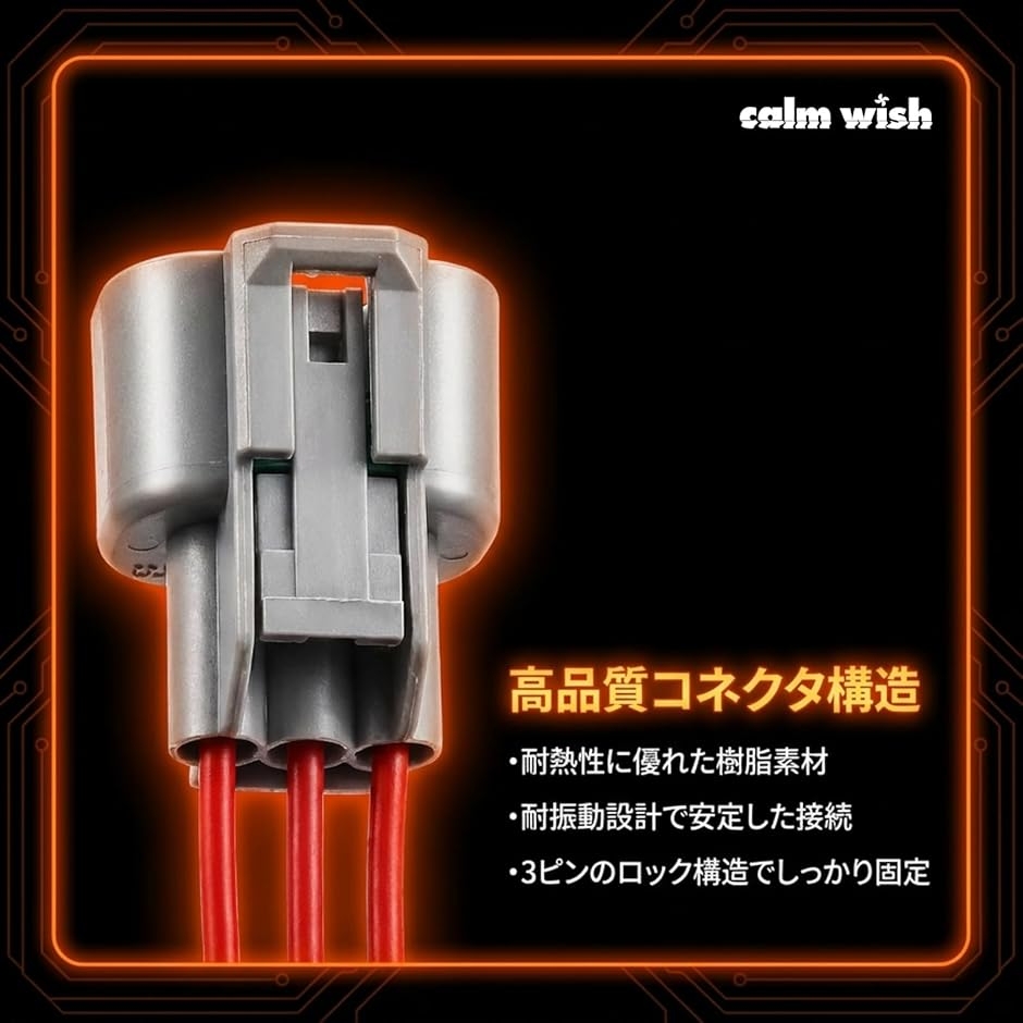 「高品質コネクタ構造」 耐熱性と耐振動性に優れた樹脂素材を採用し、エンジンルーム内の高温環境でも長期間安定して使用可能です。