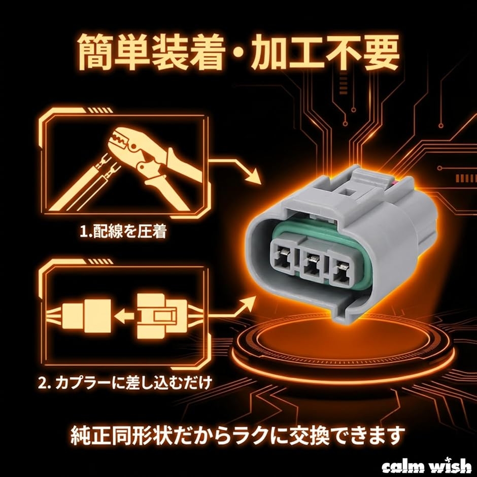 「簡単装着・加工不要」 純正カプラーと同形状のため、配線を圧着して差し込むだけで交換が完了します。