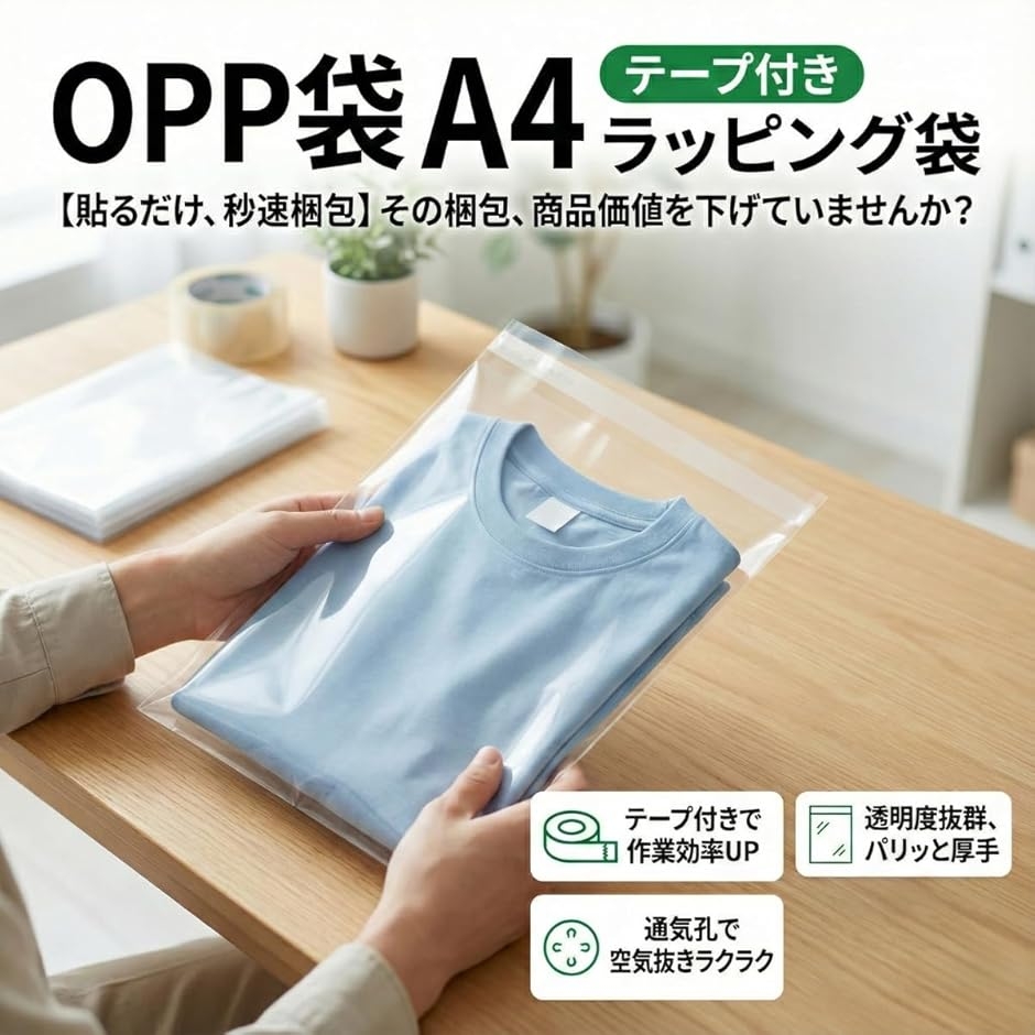 | 商品名 | OPP袋 A4 透明 テープ付き ラッピング袋 大判 貼るだけ、秒速梱包 梱包袋 資材 袋 クリアパック ビニール袋 |