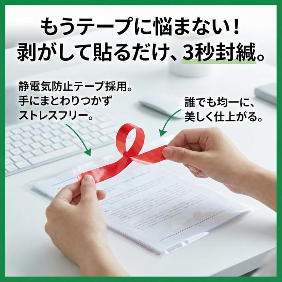 作業効率を劇的に変えるテープ付き」袋詰めの後、セロハンテープを探したり曲がらないように貼ったりするあの面倒な作業はもう不要です。