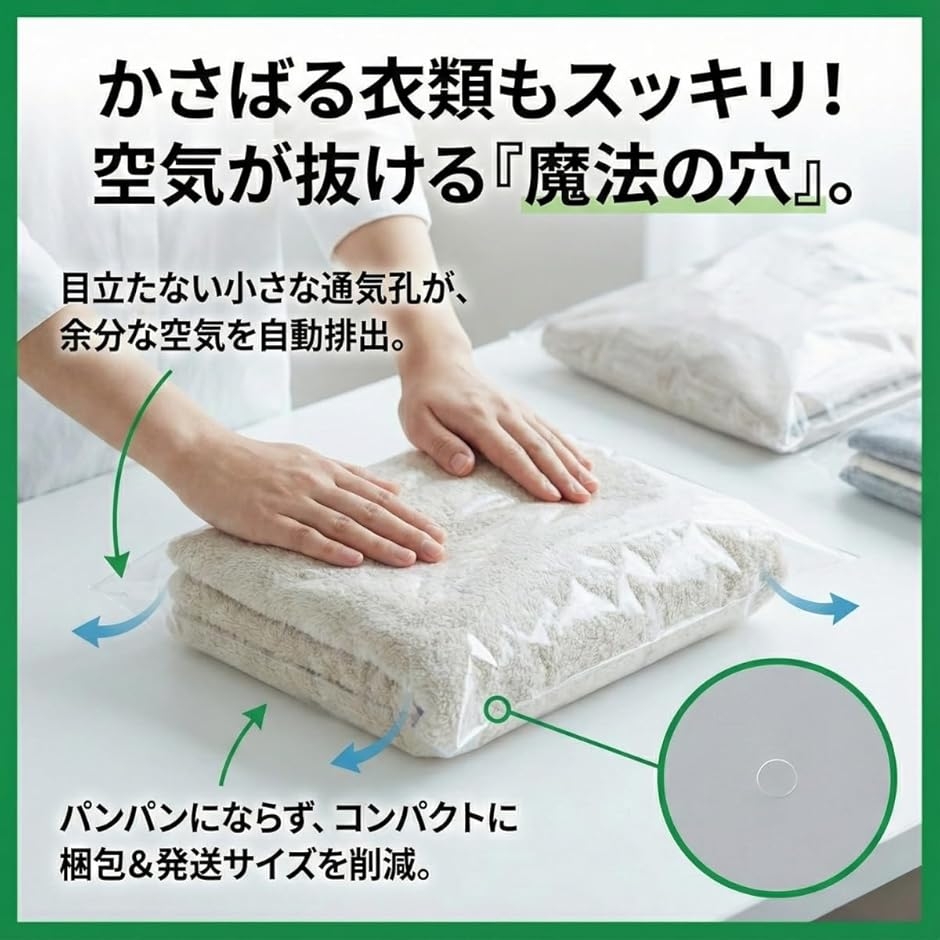 アパレル梱包の救世主、「通気孔」」厚手のセーターやTシャツ、ぬいぐるみを梱包する際、袋の中の空気が抜けずにパンパンになる。
