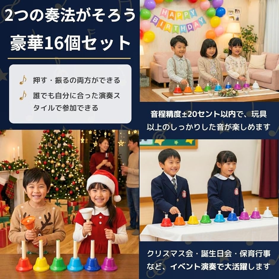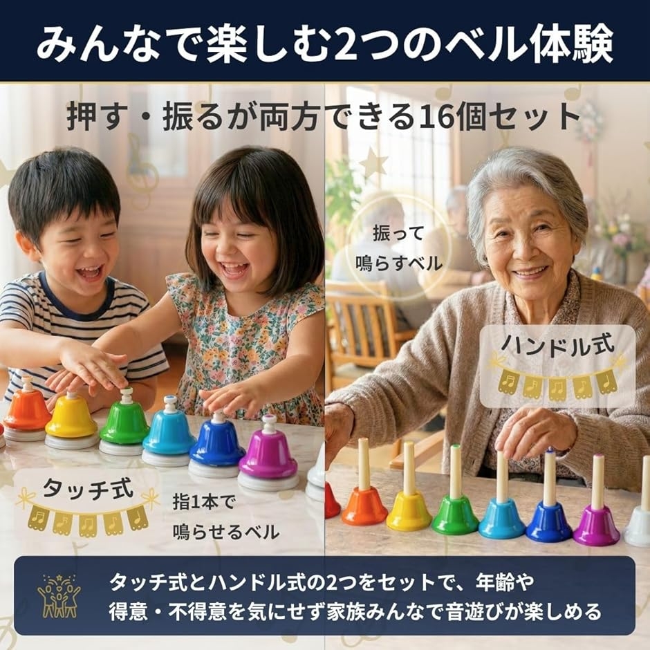 「商品詳細」 <内容>:ミュージックベル16個セット(タッチ式8音+ハンドル式8音) <演奏方法>:タッチ式(上部を押して発音)/ハンドル式(振って発音) <サイズ>:タッチ式 約8x8cm、ハンドル式 約11x5cm <カラー>:各タイプ8色(音階ごとに色分け) <特徴>:音名表示付き、直感的に演奏可能、楽器初心者向け <用途>:音楽学習、知育遊び、発表会、レクリエーションなど*対象年齢6歳以上