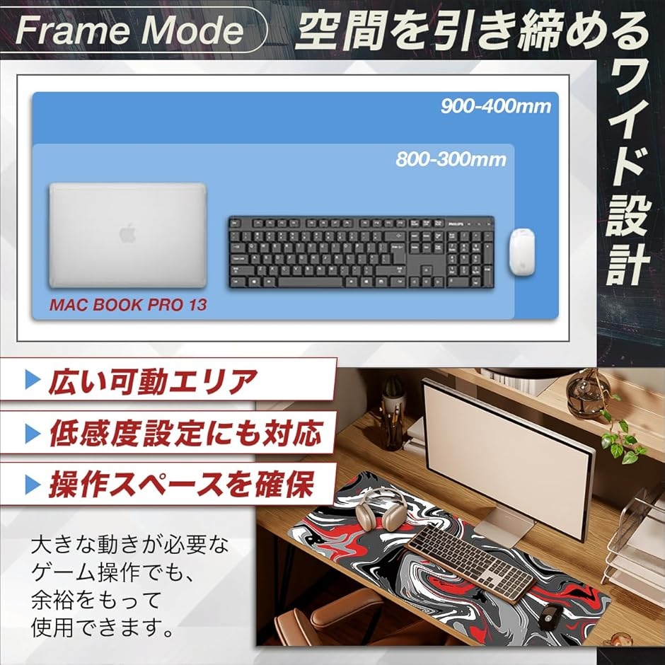 「400x900mm大型設計でデスクを一体化する没入感」 本ゲーミングマウスパッドはワイドサイズを採用した大型デスクマットです。