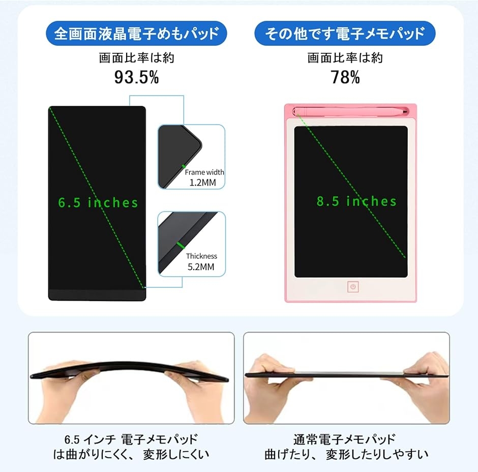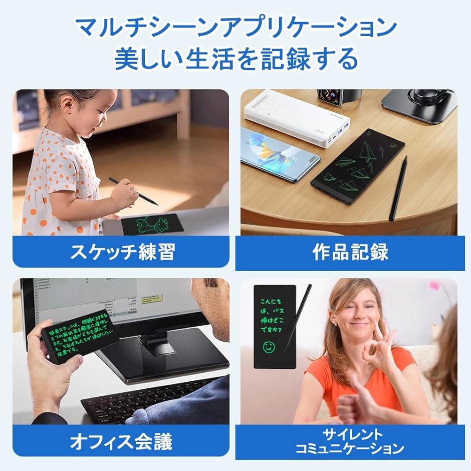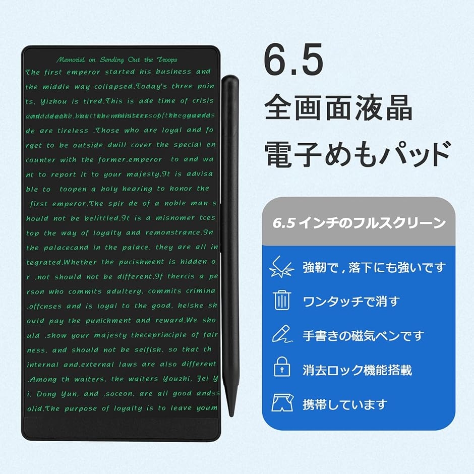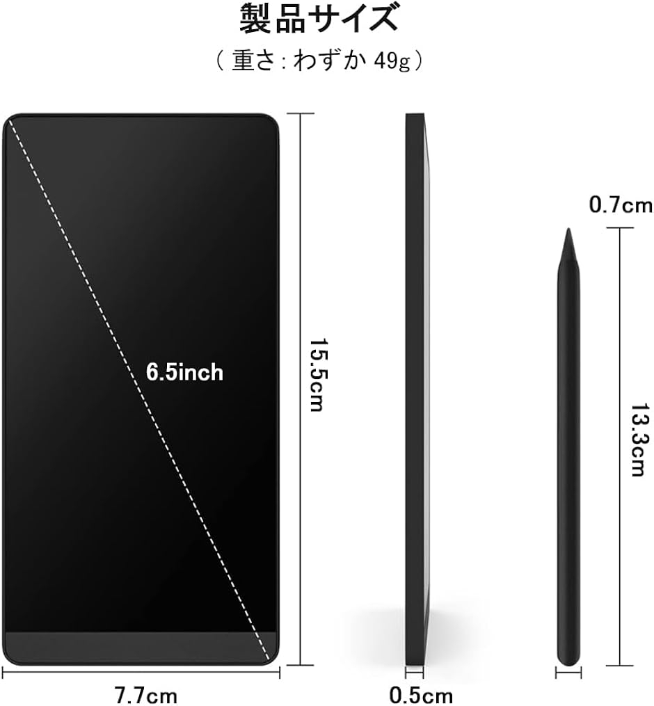| 商品名 | 電子メモパッド 6.5インチ 超薄型49g ロック機能付き 交換可能電池 ワンタッチ消去 マグネットペン同梱 会議メモ 学習ノート 子供のお絵描き プレゼントに最適 指紋防止 |