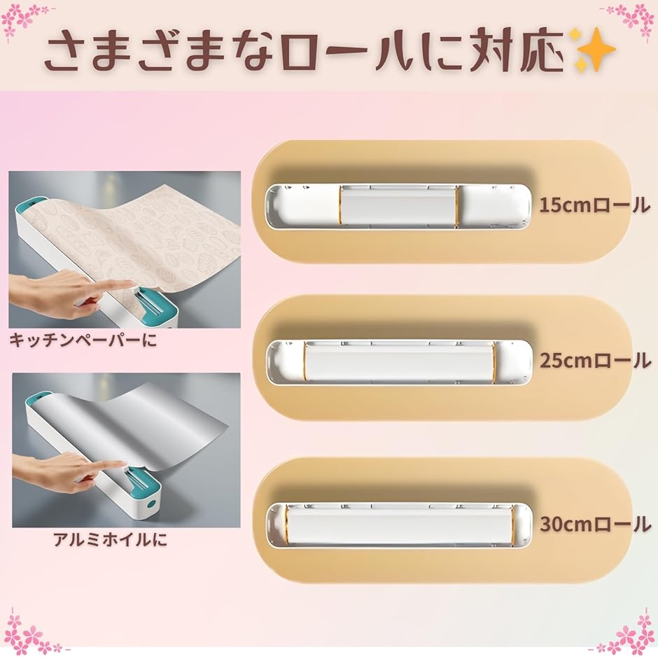 「さまざまなロールに対応」一般的なラップはもちろん、アルミホイルやクッキングシートなど幅広いロールに対応し、1台で複数用途に使える便利なキッチングッズです。