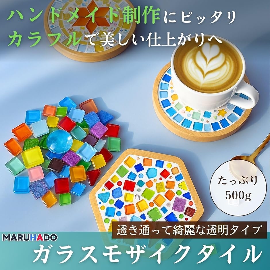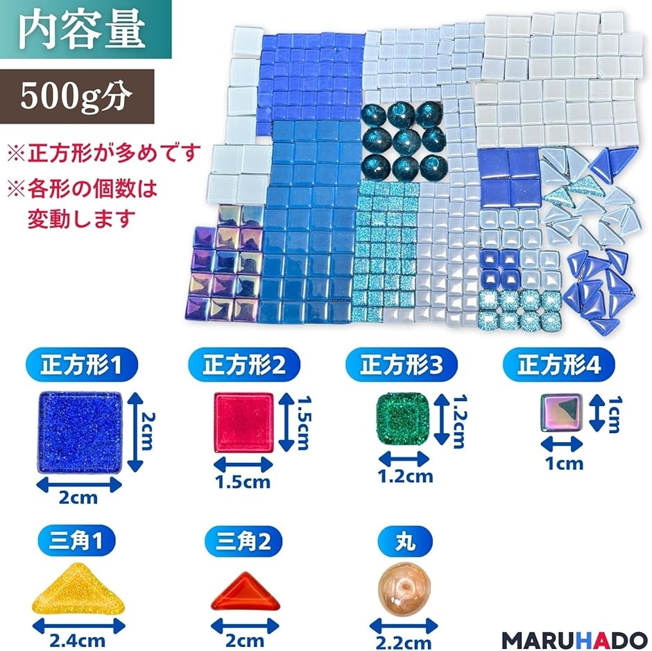 | 商品名 | モザイクタイル ガラス 500g 不揃い 大容量 サイズ混合 ハンドメイド デコレーション 工作 陶器 四角 丸 角 |