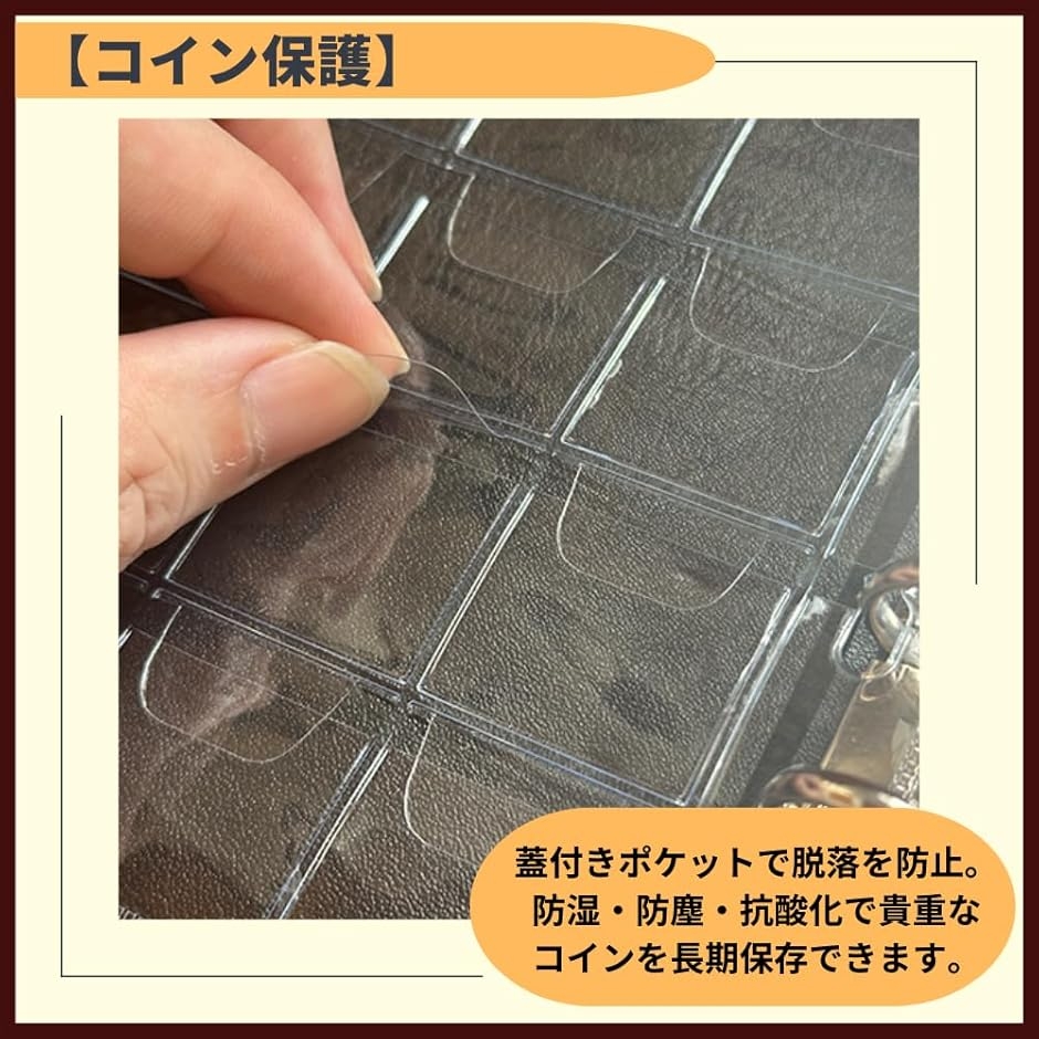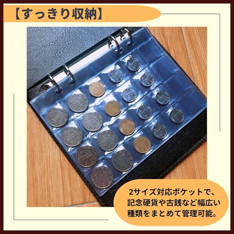 「すっきり収納」2サイズ対応ポケットで、記念硬貨や古銭など幅広い種類をまとめて管理可能。