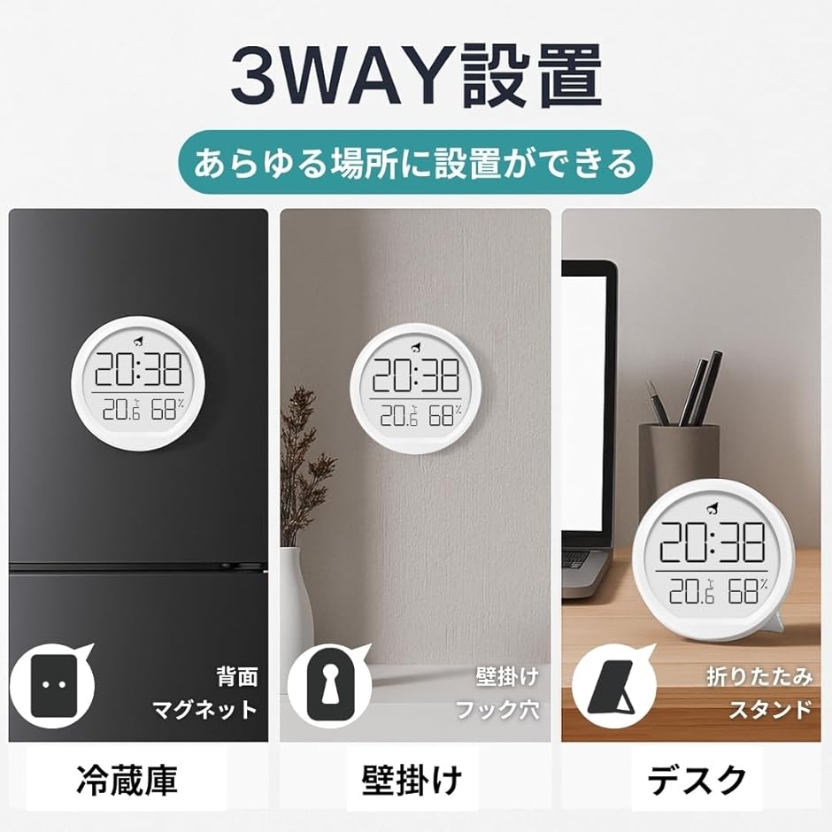 「3WAY設置」折りたたみスタンド、背面マグネット、壁掛けフック穴の三方式を装備。