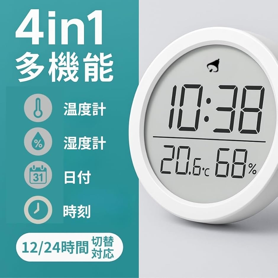 「4in1で多機能」温度・湿度・時刻・日付をひと目で確認でき、アラームも搭載。