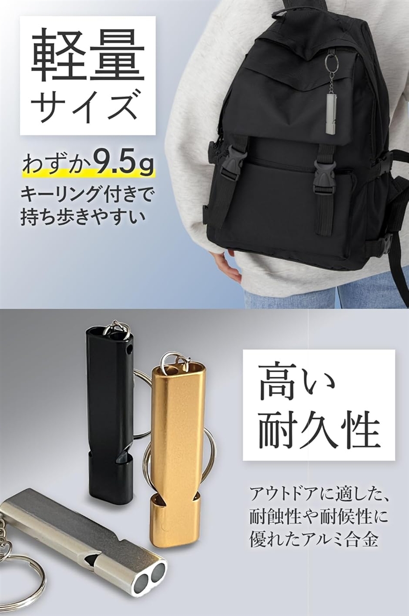 防災用ホイッスルとしてはもちろん、登山・キャンプなどのアウトドアシーンでも助けを求めるアウトドアホイッスルとしてもおすすめです。