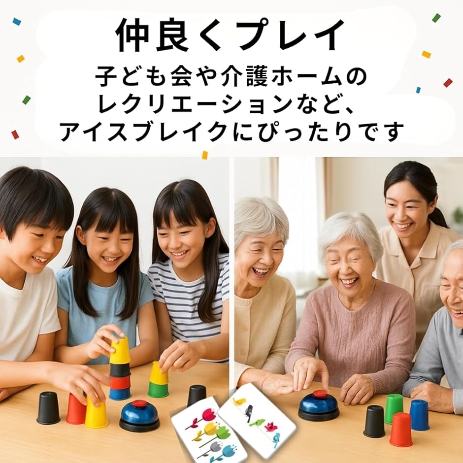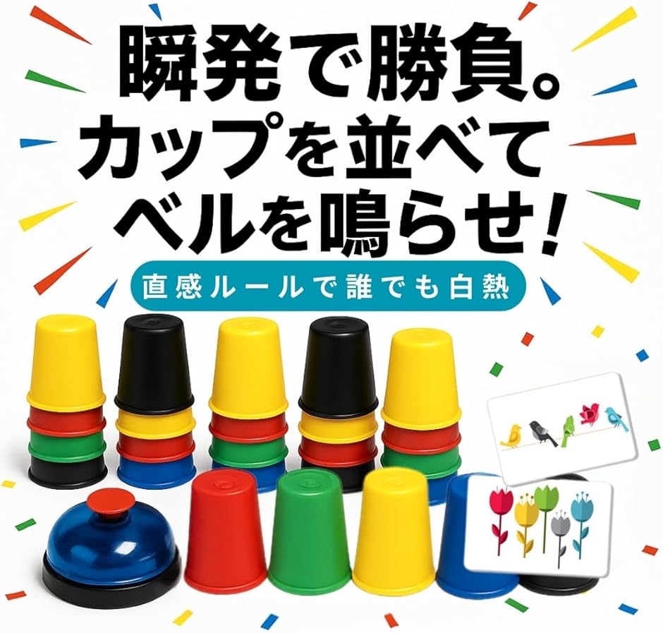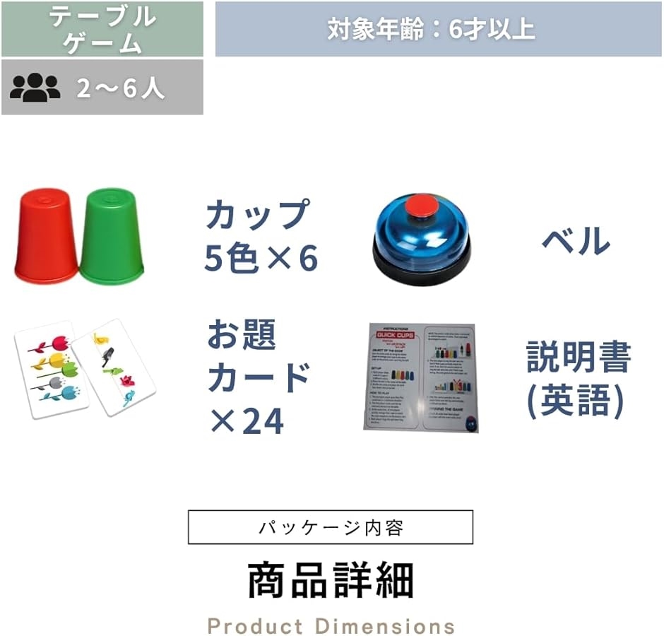 「商品内容」対象年齢:6才以上 パッケージ内容:カップ(赤、青、緑、黄、黒 各6個) カードx24枚 ベルx1個 パッケージサイズ(約):32cmx27cmx5cm *サイズ詳細は商品画像をご確認ください。