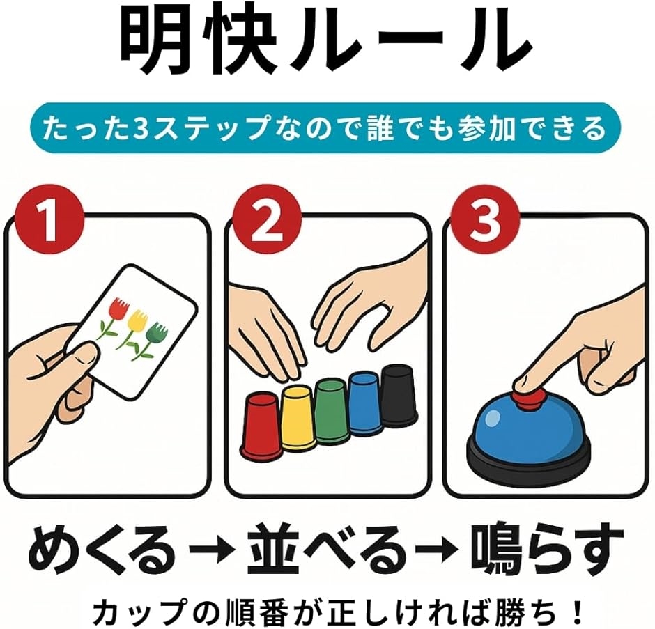 「明快ルール」手順は「カードをめくる>示された順に並べる>鳴らす」。