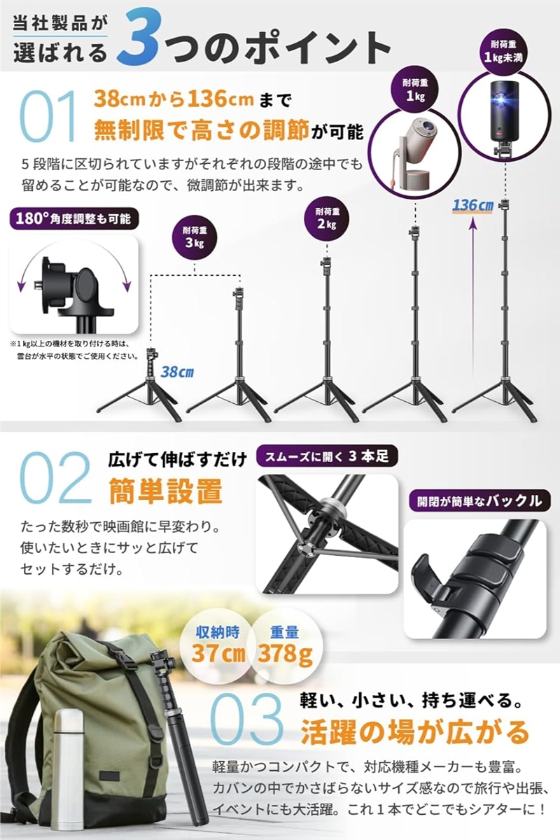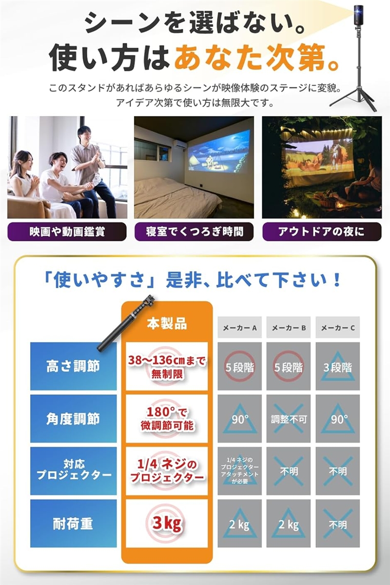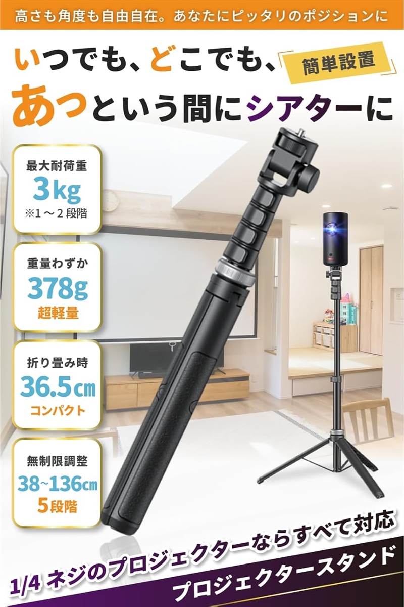 | 商品名 | プロジェクター スタンド 三脚 AnkerNebula ネビュラ対応あなたにピッタリのポジションで1/4ネジのプロジェクターならすべて対応 最大耐荷重3kg |