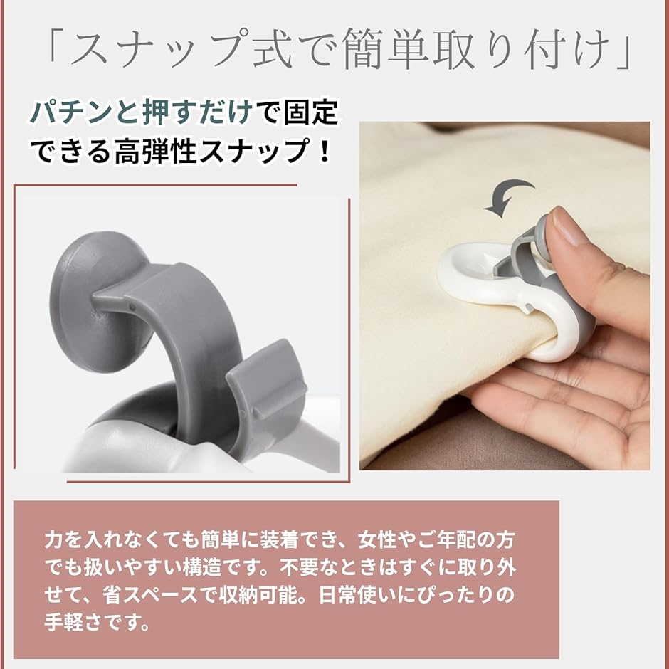 「スナップ式で簡単取り付け」 パチンと押すだけで固定できる高弾性スナップを採用。