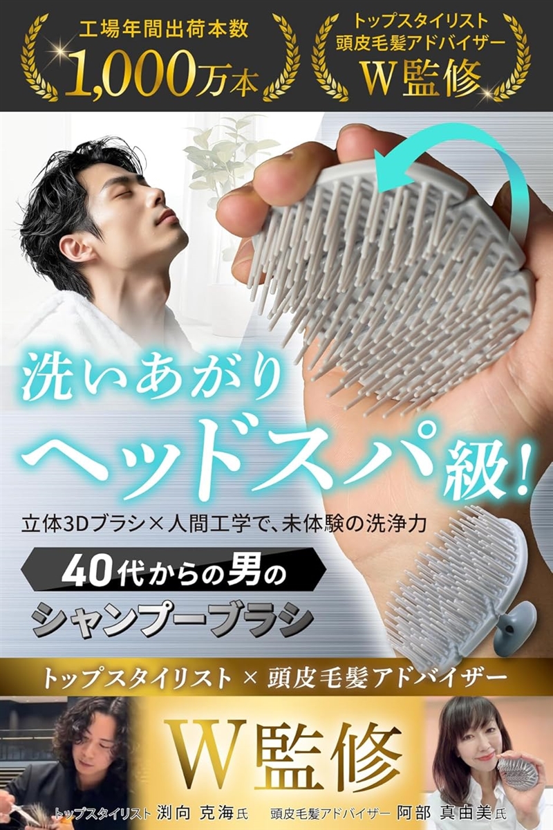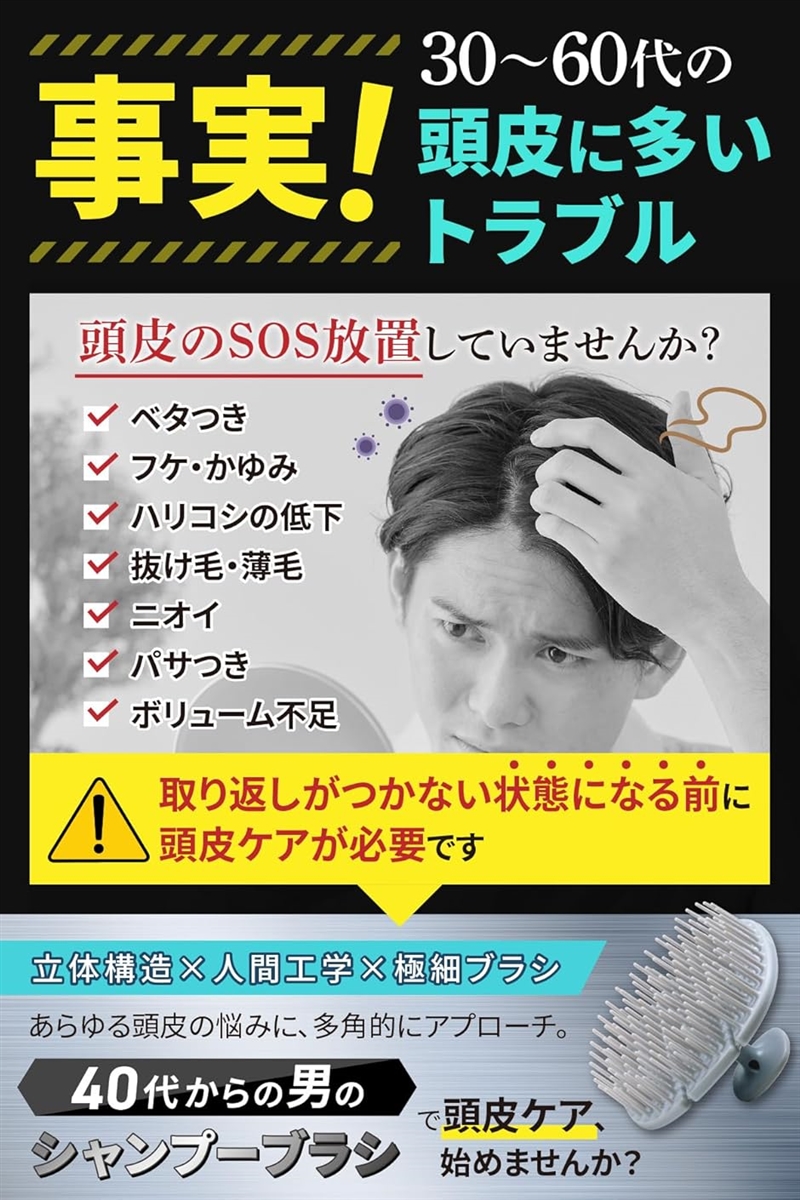 「40代からの男のシャンプーブラシ」「頭皮のベタつきが気になる」「頭皮が固まっている」「フケが気になる」「頭皮のかゆみと臭いに悩んでいる」そんなお悩みを持つ方におすすめの頭皮ブラシです。