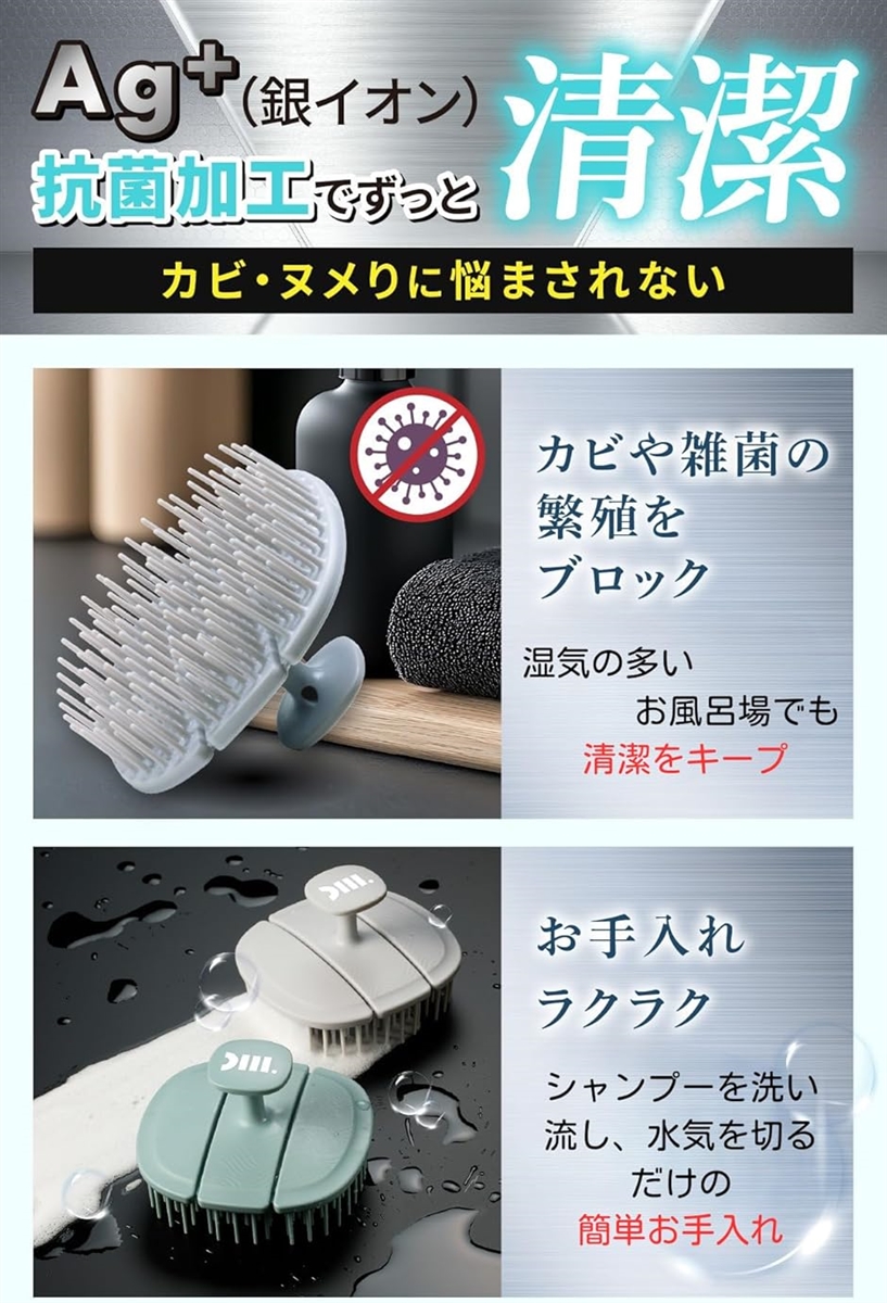 「商品詳細」*ブランド名:Dear Mr. *カラー:アイスグレー(ノーマルタイプ)、アイスグリーン(ハードタイプ) *素材:TPEE「熱可塑性エラストマー」(抗菌Ag+配合)*サイズ:84mmx88.5mmx56mm *用途:シャンプーブラシ、頭皮ブラシ、スカルプブラシ