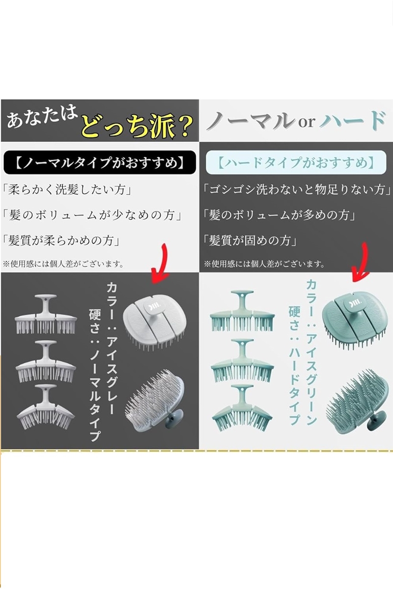 「お好みの硬さを選択可能」「柔らかく洗髪したい方」「髪のボリュームが少なめの方」「髪質が柔らかめの方」はノーマルタイプがおすすめ。「ゴシゴシ洗わないと物足りない方」「髪のボリュームが多めの方」「髪質が固めの方」はハードタイプがおすすめです。