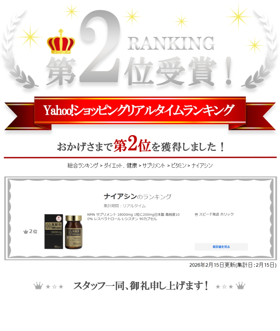 原材料:β-ニコチンアミド・モノヌクレオチド(国内製造)、マルトデキストリン、ゼラチン、赤ワインエキス末/ステアリン酸カルシウム、シスチン