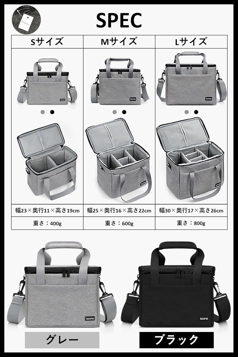 「サイズ」Sサイズ:横幅23x奥行11x高さ19cm Mサイズ:横幅25x奥行16x高さ22cm Lサイズ:横幅30x奥行17x高さ26cm 「重さ」Sサイズ:400g Mサイズ:600g Lサイズ:800g「カラー」グレー、ブラック
