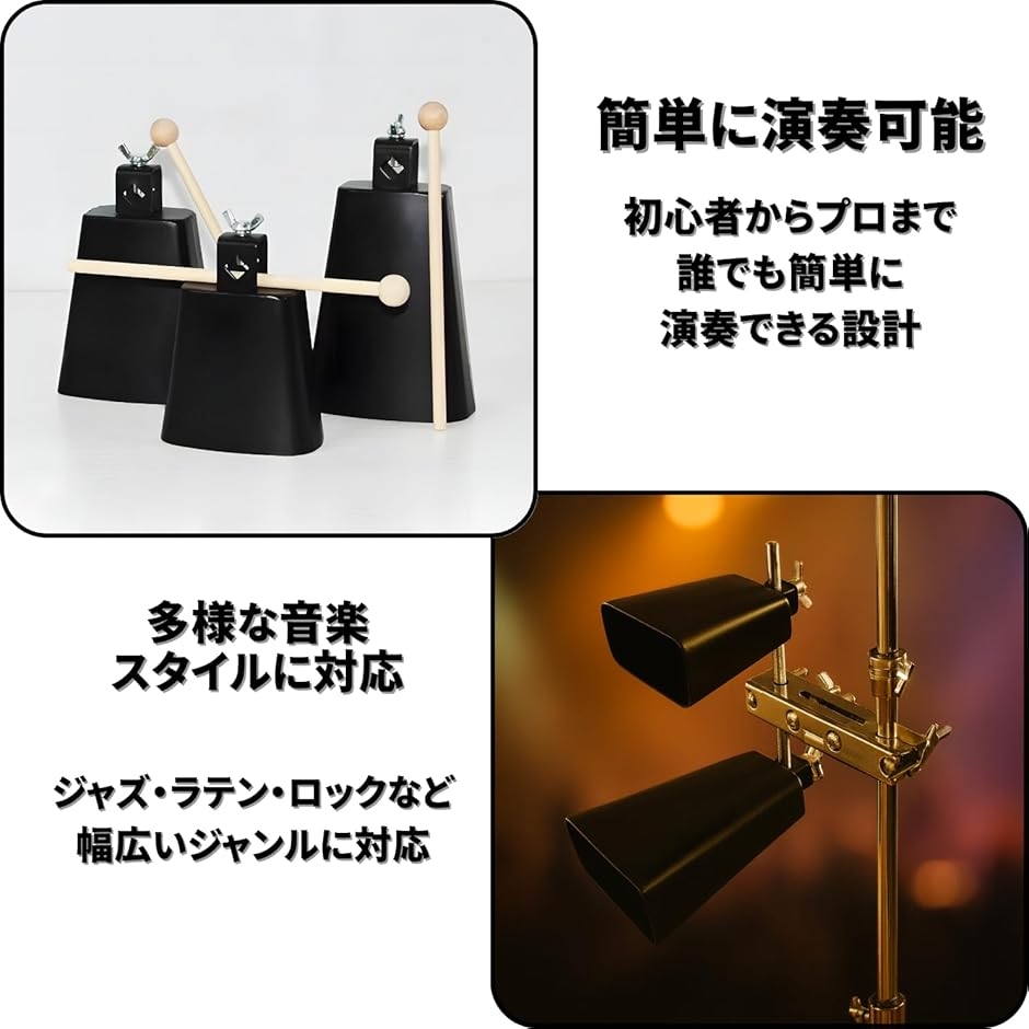 「多様な音楽スタイルに対応」このカウベルは、ジャズ、ラテン、ロックなど、さまざまな音楽スタイルにマッチします。