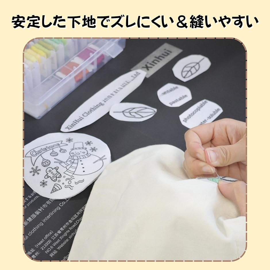 ミシン刺繍やレース刺繍、アップリケなどの繊細な作業をサポートし、縫い終わったあとは水で簡単に溶かして跡形もなくスッキリ除去できます。