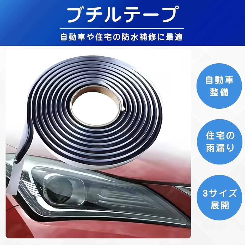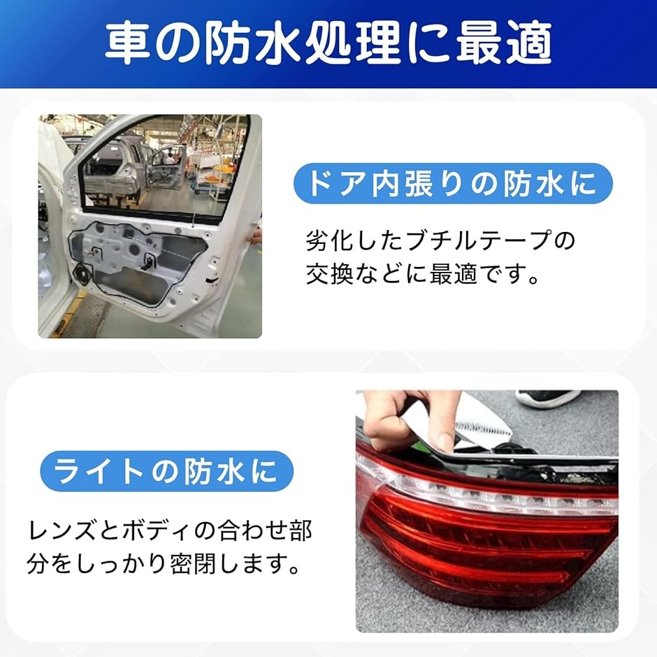 「多用途に使える防水シール」車のドア防水シートの接着やヘッドライト・テールランプのシーリング、ガラス周りやサンルーフの雨漏り補修まで幅広く対応できるブチルゴム製テープです。
