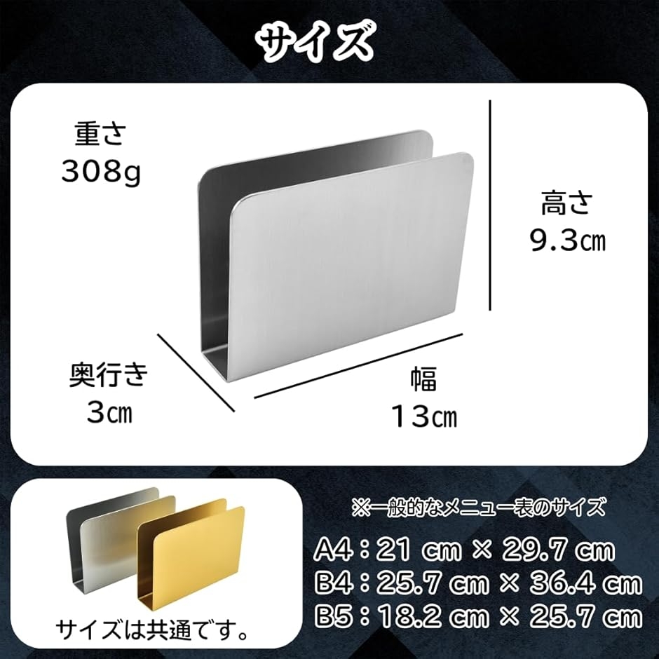 「スタイリッシュメニューホルダー」シンプルで洗練されたデザインのステンレスメニュー立てです。
