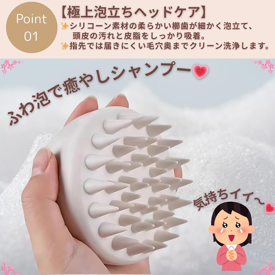 「泡立ちヘッドケア」 シリコーン素材の柔らかい櫛歯が細かく泡立て、頭皮の汚れと皮脂をしっかり吸着。
